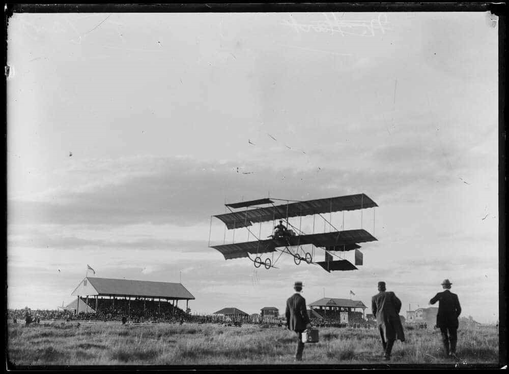 Dentist William Hart, holder of Australian pilot licence number 1 flying a bi-plane, Sydney, c.1912. Courtesy National Library of Australia